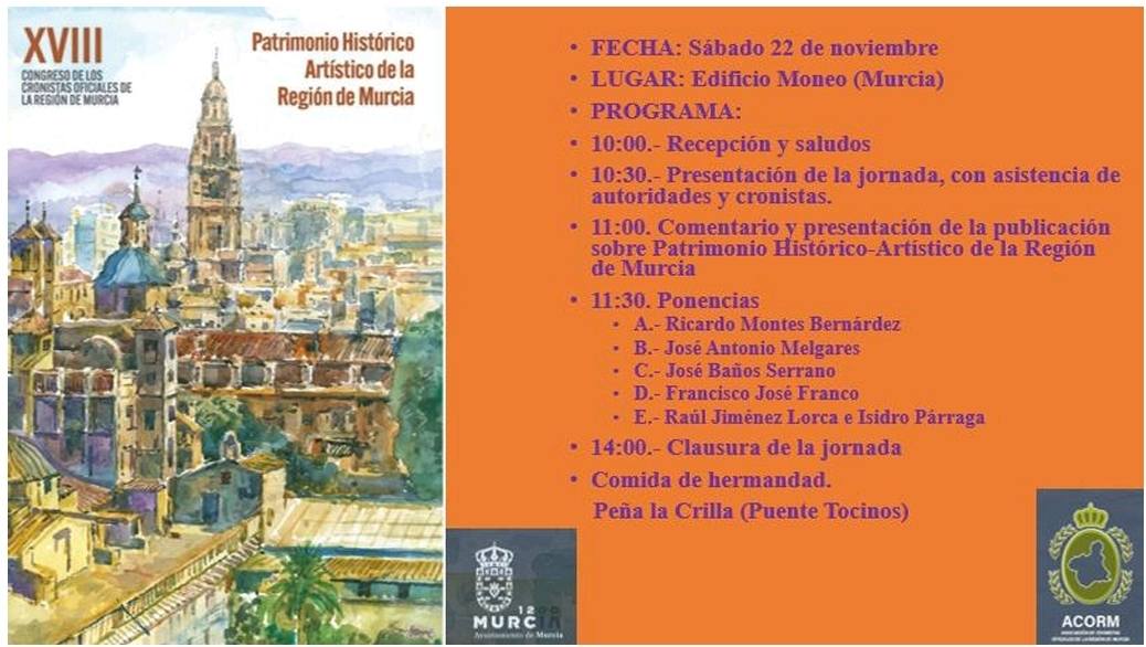 El próximo sábado 22 de noviembre el edificio Moneo acogerá el XVIII Congreso de Cronistas de la Región de Murcia. Durante el desarrollo del mismo se podrá disfrutar de algunas de las comunicaciones enviadas por Cronistas de toda la Región.